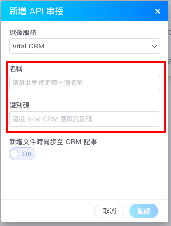 在視窗中輸入 API 的名稱,並貼上 CRM 的識別碼,確認資料無誤後,即可點擊右下角「儲存」。