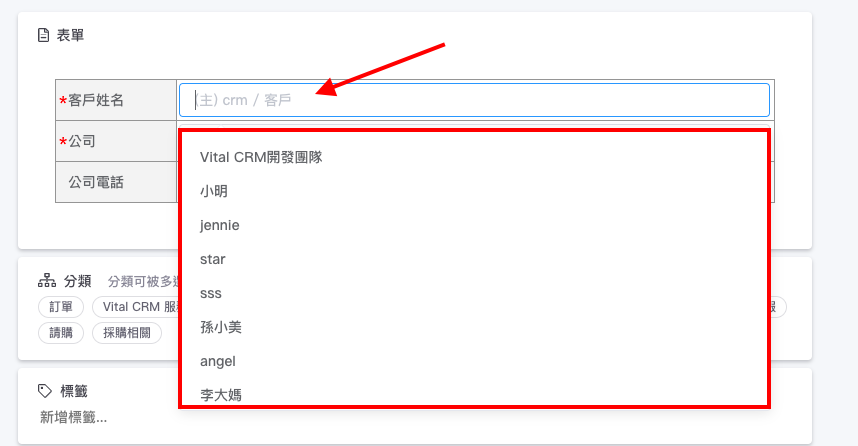 在填寫含有 API 關聯欄位的表單時,點擊該欄位,可以在下拉選單中選擇您要的資訊,或是您可以輸入關鍵字,系統會抓取 CRM 系統中既有的資料。