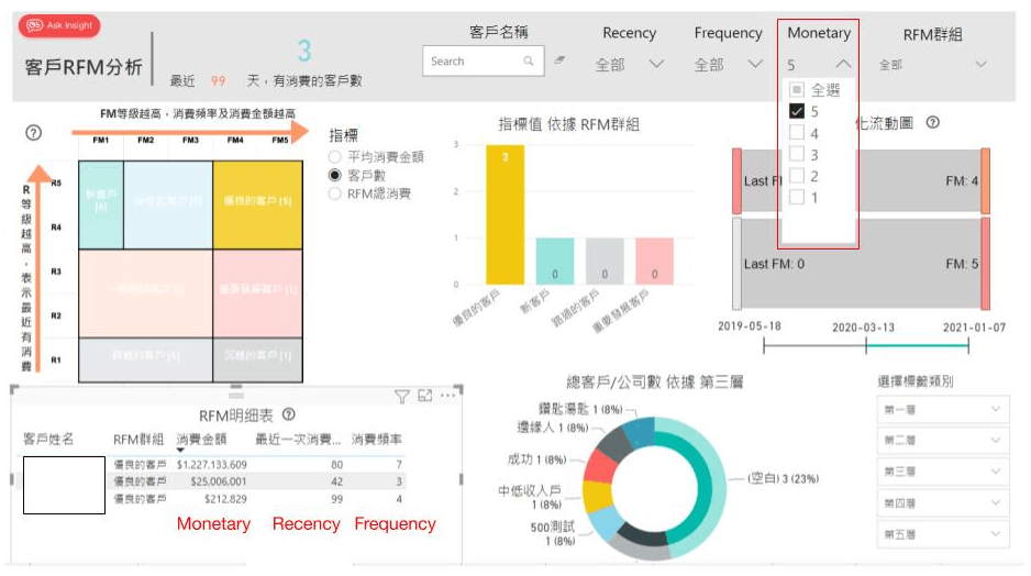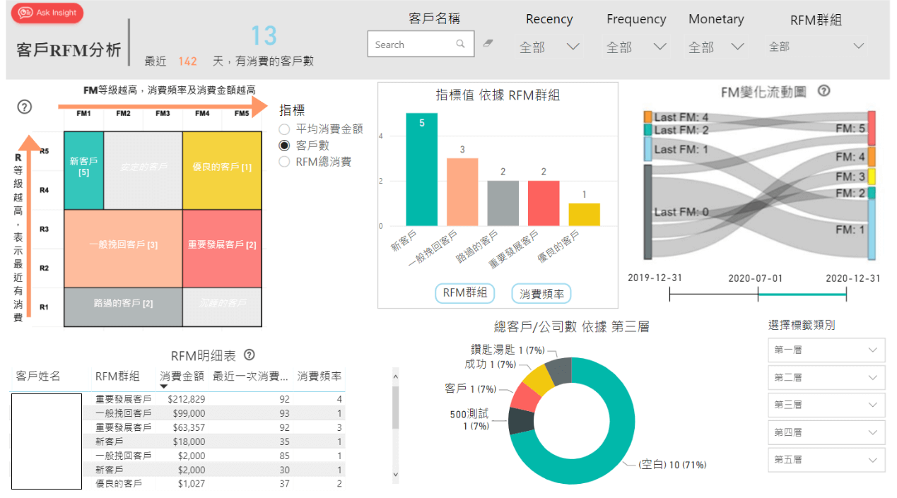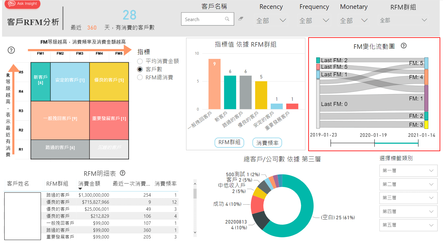 既有 RFM 圖表與 FM 變化流動圖搭配應用,能幫助企業或品牌更活用數據,針對企業本質的客戶留下的能力進行檢討,經由數據來幫助企業未來發展。