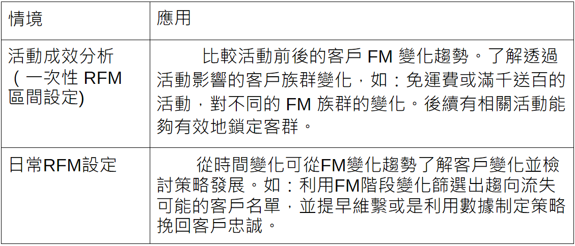 RFM 分析主要使用 Recency(最近一次購買)、Frequency(購買次數) 、 Monetary(平均購買金額) 三種角度分析客戶消費行為,將客戶依其消費屬性分群,設定固定區間得到的分群結果。RFM 中的 Frequency (購買次數)為依據購買習慣表達客戶對品牌的忠誠程度、Monetary(平均購買金額)則表示客戶的消費力,FM 分群的變化能表達客戶價值的提升或下降。