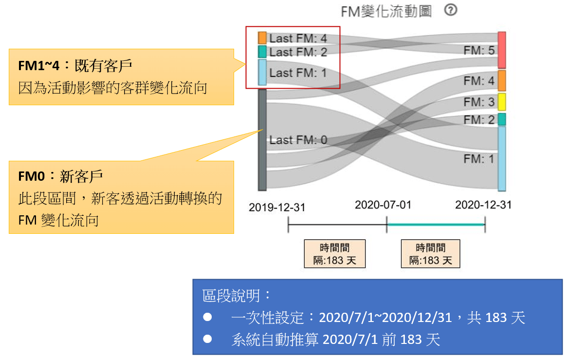 (1) 活動期間為 2020/7/1~2020/12/31 前 183 天的新客戶(FM0),被活動吸引而來的 FM 變化流向