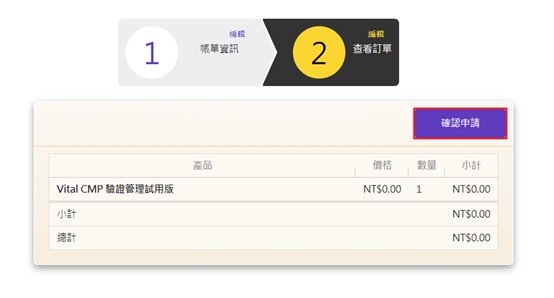登入後,系統會引導到購物車的畫面,請檢視訂單資訊後,點選「確認申請」。