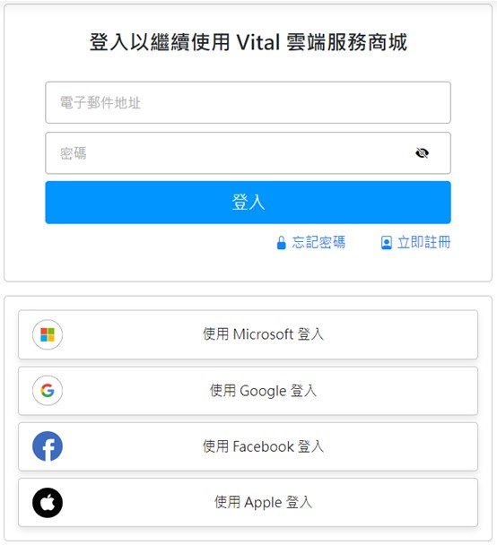 如果您沒有登入或註冊過Vital雲端服務家族官方網站,系統會引導您進入登入/註冊畫面。
