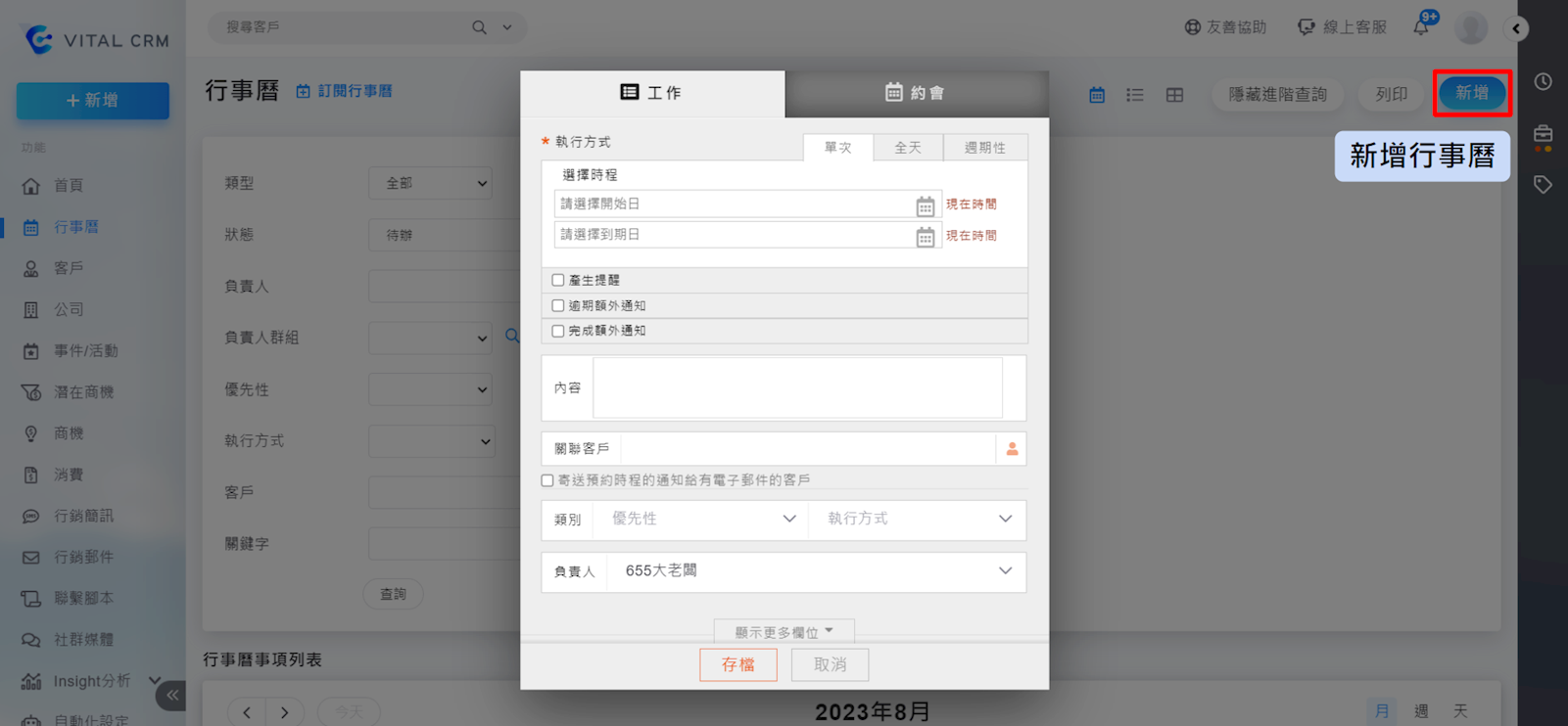 1. 點擊畫面右方【新增】按鈕,進行工作(或約會)設定。