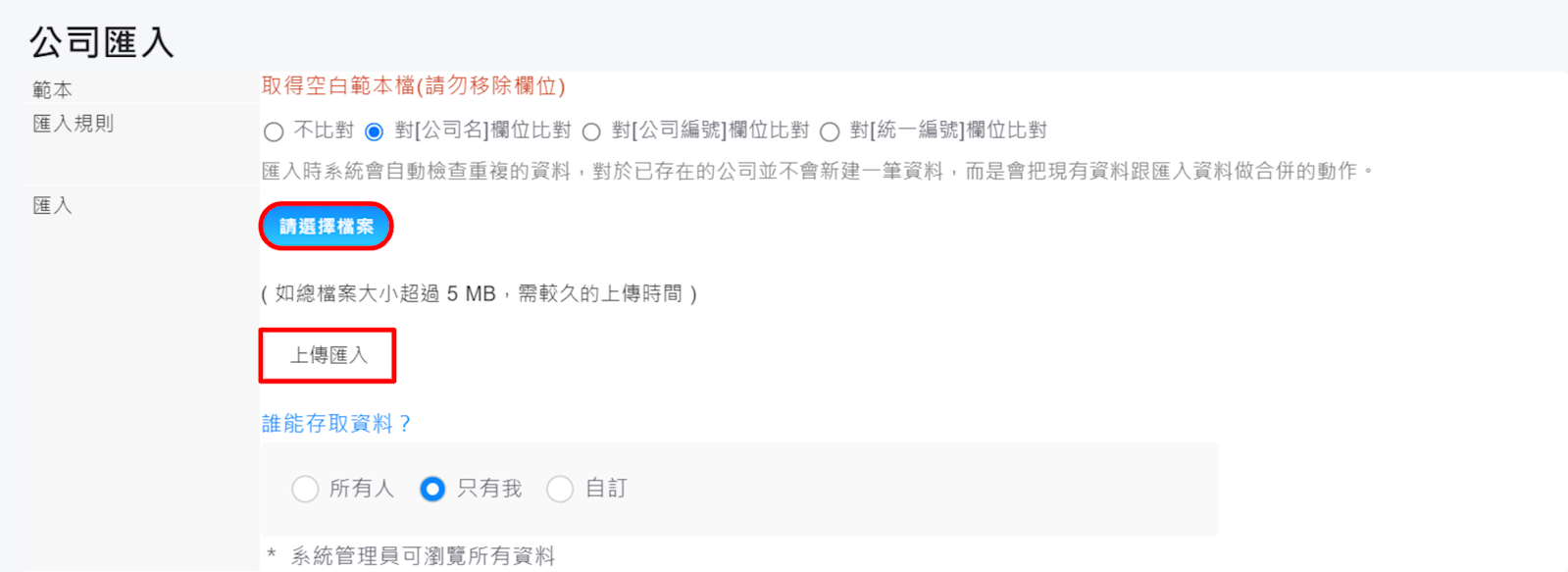 請使用Excel整理公司檔案後,上傳匯入;也可以下載系統中的空白範本,填寫完成後再進行上傳。