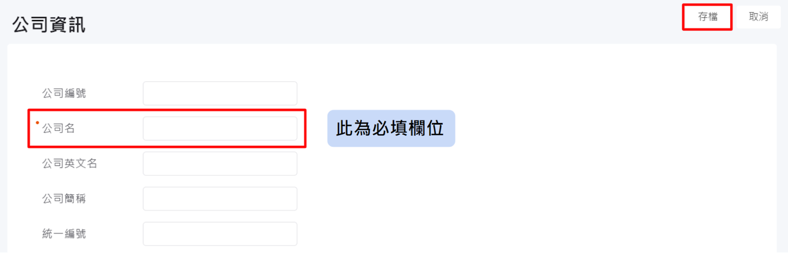 系統都有預設基本公司資料欄位,依欄位名稱輸入資料,輸入完畢後按【存檔】。
