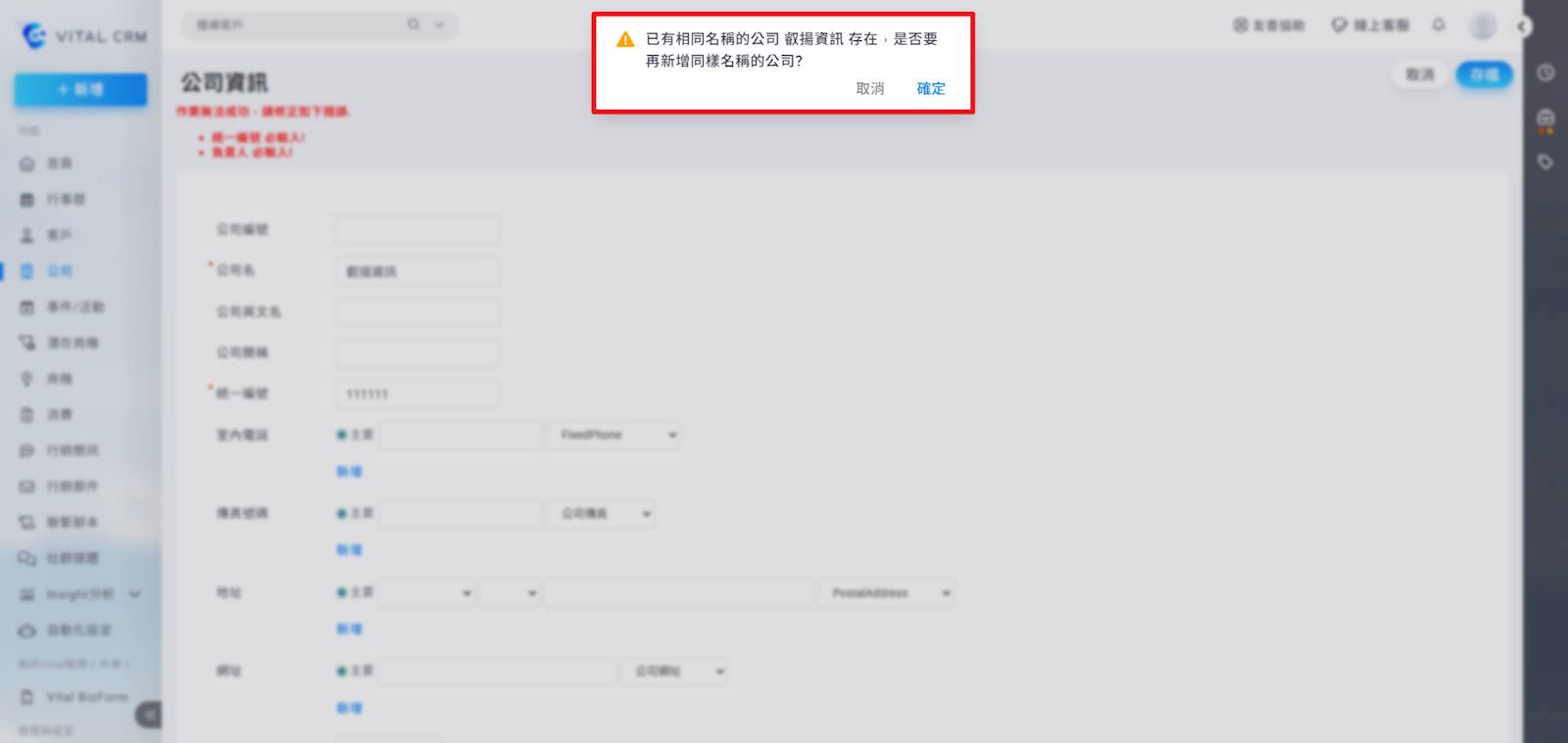 3. 如系統內已有相同名稱的公司資料,存檔前會跳出提醒,確認後即可繼續存檔,同一「統一編號」可設定多筆不同的公司名稱。