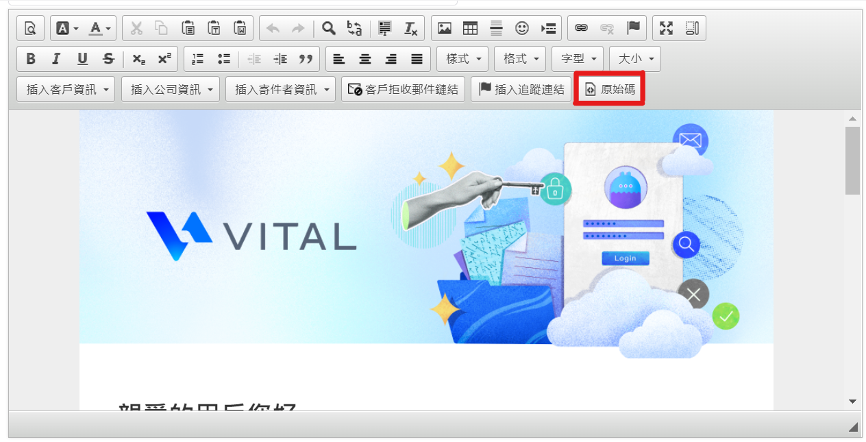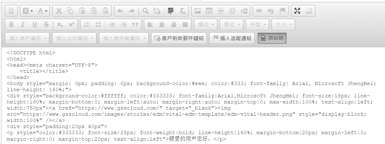 點選行銷郵件中的"原始碼",接下來即可進行編輯html。