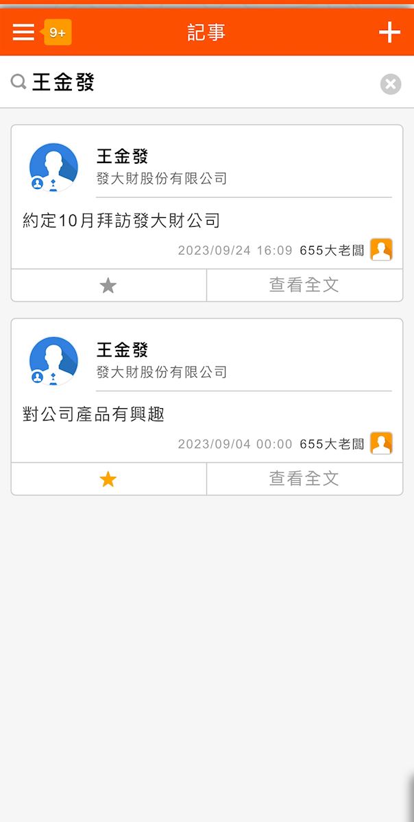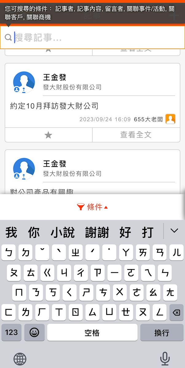 APP 記事提供關鍵字查詢功能,可搜尋的條件包括:記事者、記事內容、留言者、關聯事件/活動、關聯客戶、關聯商機等。使用者可以使用關鍵字搜尋符合以上條件的記事。請見下圖: