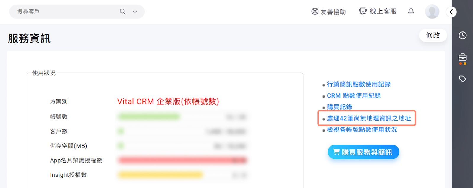 4. 請系統管理員至【管理>系統>服務資訊】,右方「處理尚無地理資訊之地址」功能,在這裡可以全數同步客戶資料的地址資訊。(補充說明:在大量匯入客戶資料(或使用API新增客戶)時,系統不會自動同步客戶的地址資訊,必須由使用者手動設定。)