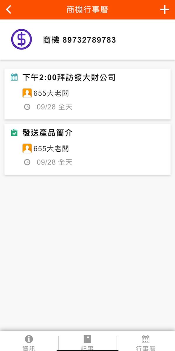 請從商機內容下方的功能列表進入,快速查看、編輯特定商機有關的行事曆事項。(請注意,此處僅顯示指定商機之行事曆工作。)