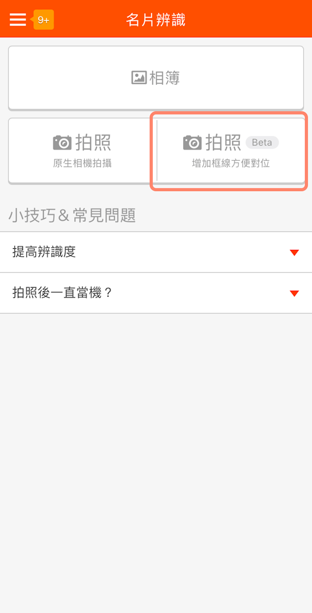 - 「拍照(Beta)」是標示出辨識區域的拍攝模式,限制為直向拍攝,名片檔會自動裁剪出辨識區域的內容。