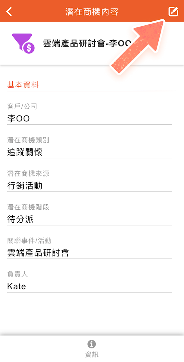 從潛在商機列表中找出相關的項目,點名稱進入詳細資料畫面,可以點擊右上方圖示前往編輯畫面。