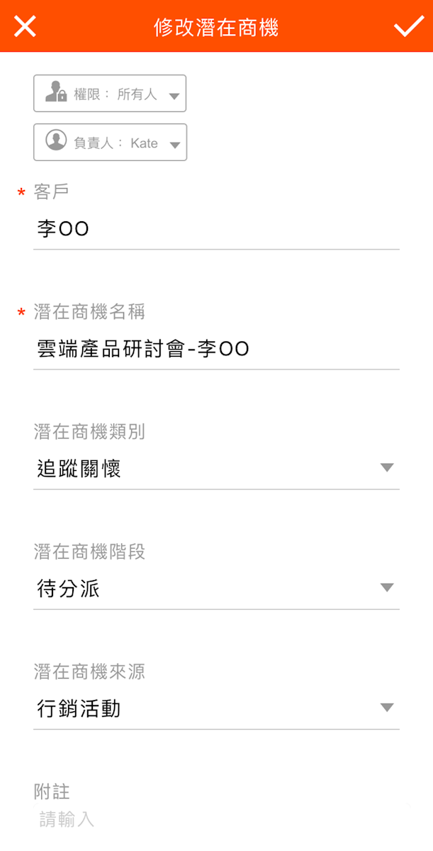 從App的潛在商機列表中找出相關的項目,點名稱進入詳細資料畫面,可以點擊右上方圖示前往編輯畫面。