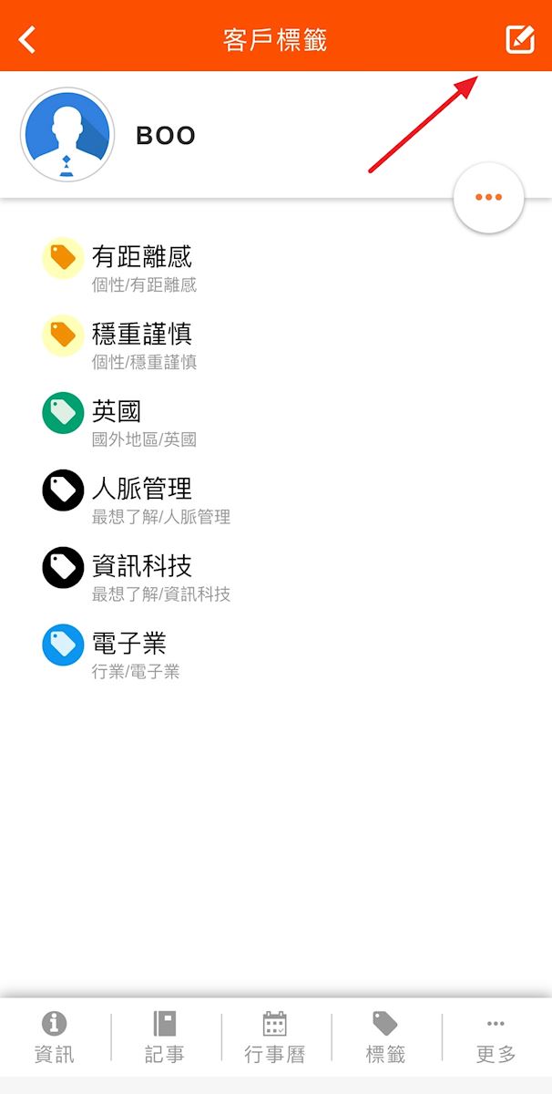 行動裝置使用APP為客戶貼上標籤,請在選擇欲貼標籤的客戶後,下方列表中點選【標籤】,進入【客戶標籤】頁面,點選右上方的鉛筆,即可開始編輯客戶標籤。