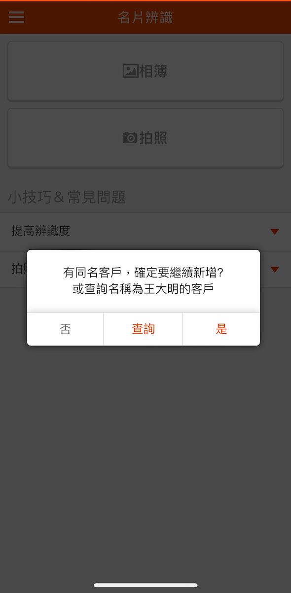 以掃描名片的方式來新增客戶時,若有多名業務人員持有相同客戶的名片,可能造成重複新增的狀況。因此,在成功辨識名片後,若已有相同姓名的客戶存在於系統內,就會提醒使用者是否確定要繼續新增,也可以點擊「查詢」,以姓名來找出可能重複的客戶,確認沒有重複後,需再重新掃描名片,將客戶新增至系統內。