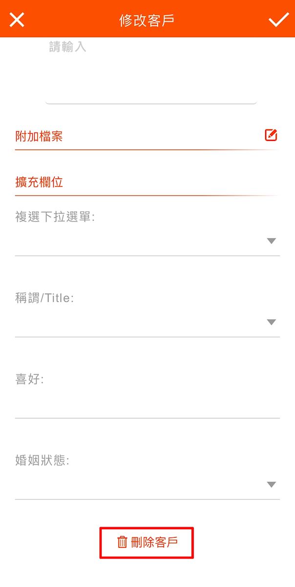 ※刪除:在修改介面向下滑動,點擊【刪除客戶】按鈕,即可刪除客戶資料。