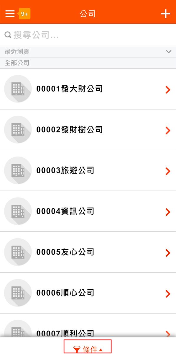 在公司列表上方的輸入框可以對公司名稱、公司簡稱、公司編號、統一編號進行關鍵字搜尋;若使用下方條件搜尋,展開搜尋條件後,可以指定對應欄位,並加以排序。