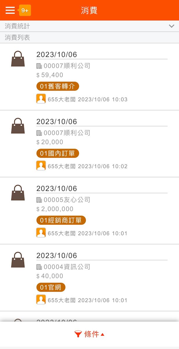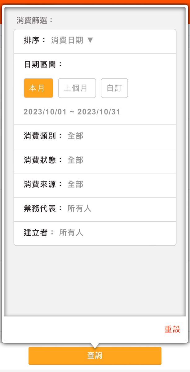 在功能列表中點擊「消費」功能,即可展開消費列表,更可以使用條件來過濾資料,並查看消費的詳細內容。