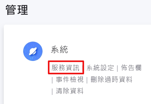 系統管理員可至「管理>系統>服務資訊」進入系統資訊頁面。
