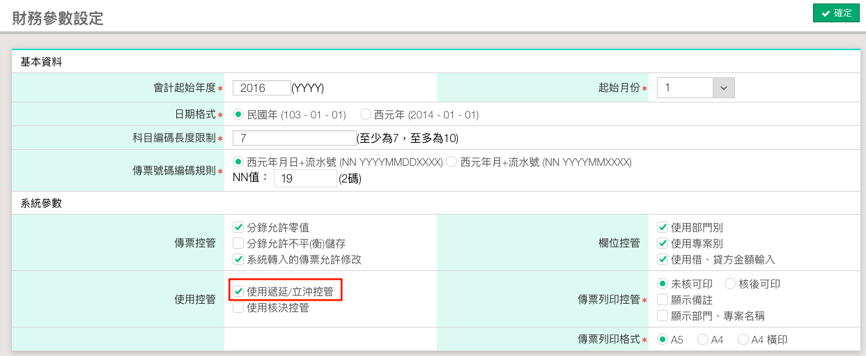 如果要使用立沖帳,首先請在「財務參數設定」勾選「使用遞延/立沖控管」