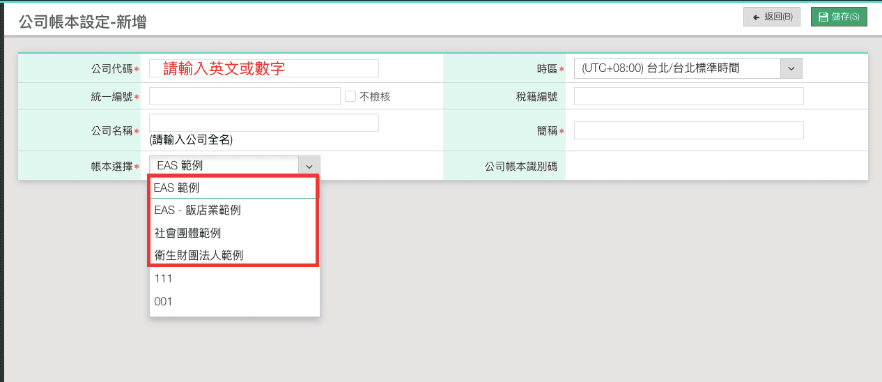 - *帳本選擇:因應不同機關屬性,系統提供以下的會計科目範例,根據您所選的帳本範例,系統會帶入符合該範例的會計科目。如果您為一般公司,建議使用系統預設的 EAS 範例。如果您是飯店業,可以使用 EAS 飯店業範例,針對社會團體和衛生財團法人,系統也有提供相符的預設範例。如果您有使用多帳本,最下方會有帳本的名稱,提供您複製該帳本的會計科目。