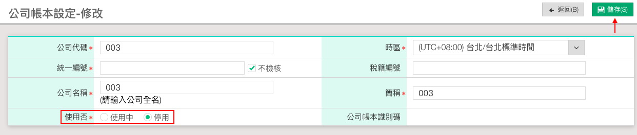 3. 在「使用否」欄位中點選「停用」,接著在右上方點擊「儲存」按鈕即可