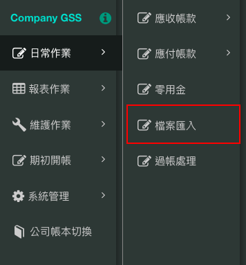 1. 系統提供應收(付)帳款立帳資料 Excel 匯入機制及收(付)帳款收、付帳資料 Excel 匯入機制,於【日常作業>檔案匯入】操作。