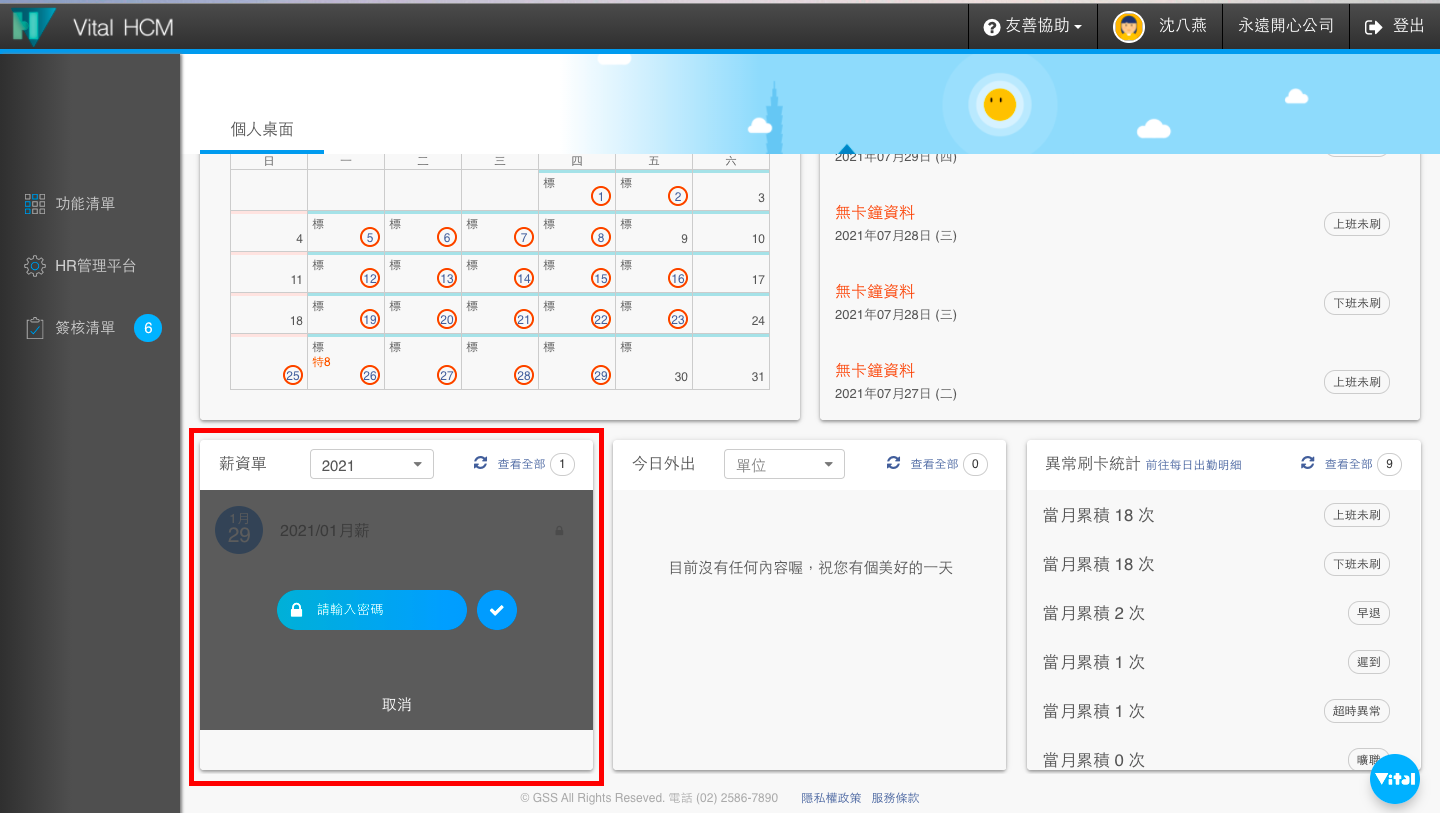 請至 HCM 系統首頁,點選儀表板中的【薪資單】區塊,點選要查看的薪資單,所有要求輸入的密碼皆為員工身分證後四碼。*若員工於電子信箱中查看薪資單,預設密碼亦是身分證號末四碼。