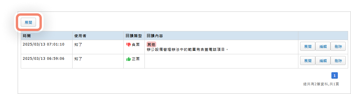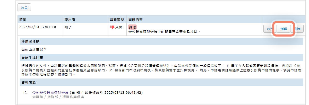2. 查詢出結果後,點選【展開】將會顯示【使用者提問】、【智能生成回覆】及【資料來源】。