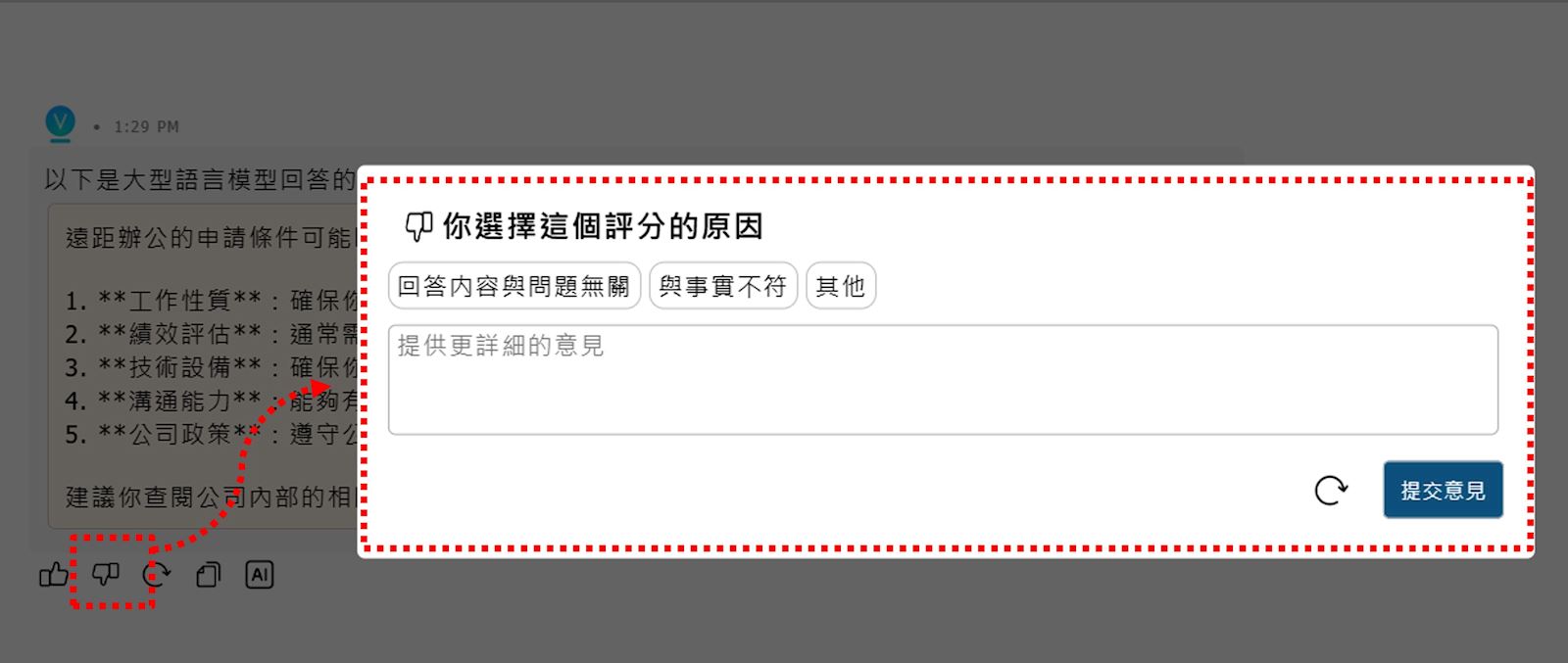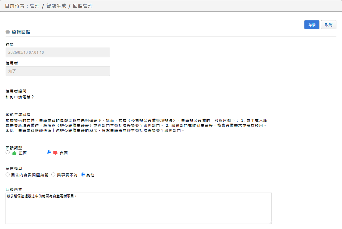 當使用者在智能生成的回答下方選擇"不好"時,可提交回饋意見,系統管理員可以到【回饋管理】中查看,提供文件作者改善文件內容,以提高生成品質。
