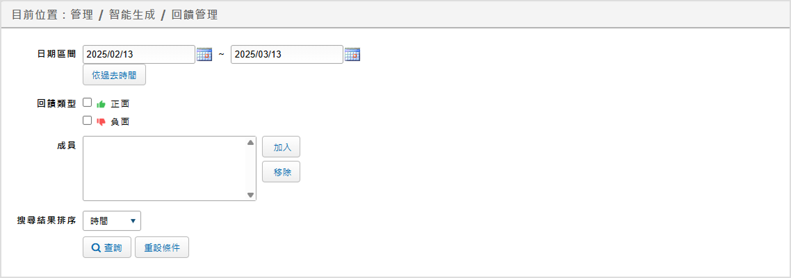 1. 請至【管理】>【智能生成>回饋管理】。管理者可以自訂篩選條件,點選【查詢】查看相關的回饋資料。