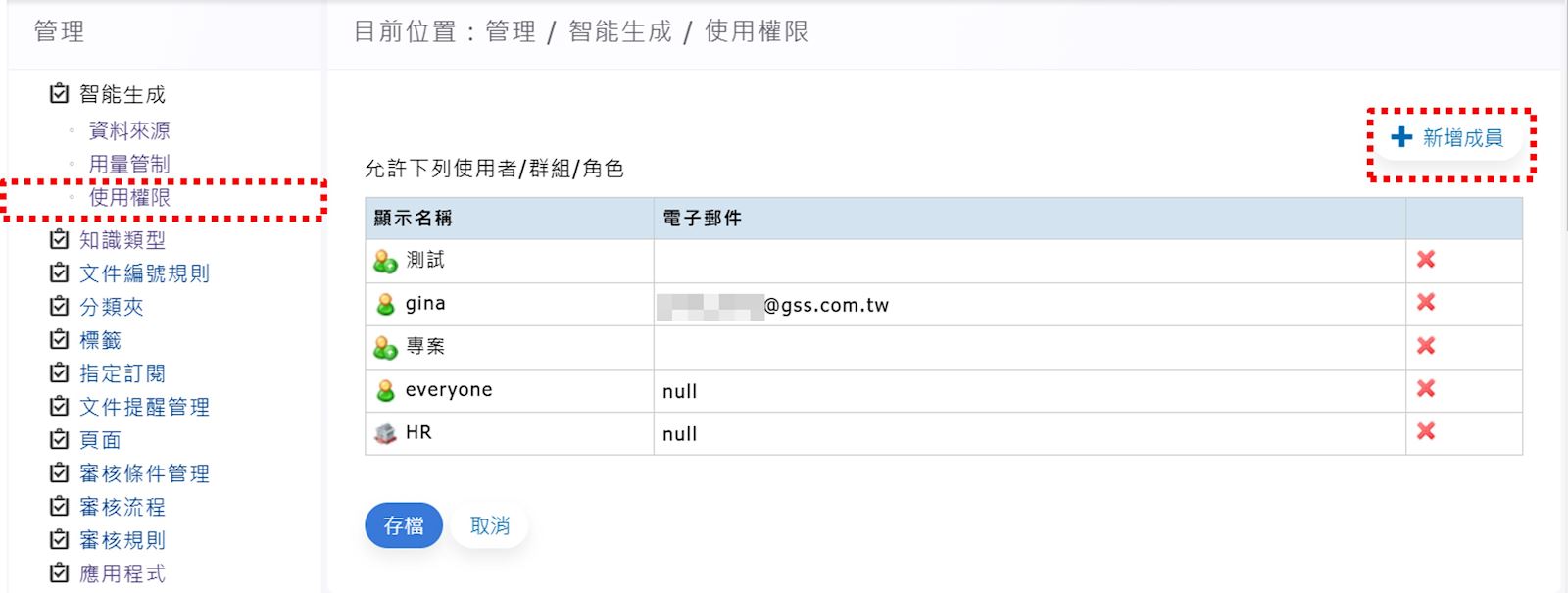 1. 請至【管理】>【智能生成>使用權限】。點選右上角【新增成員】開始加入使用者/群組/角色。點選【X】可移除,完成後請點選【存檔】。