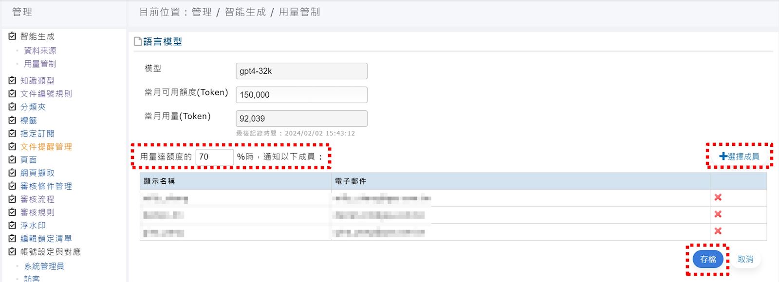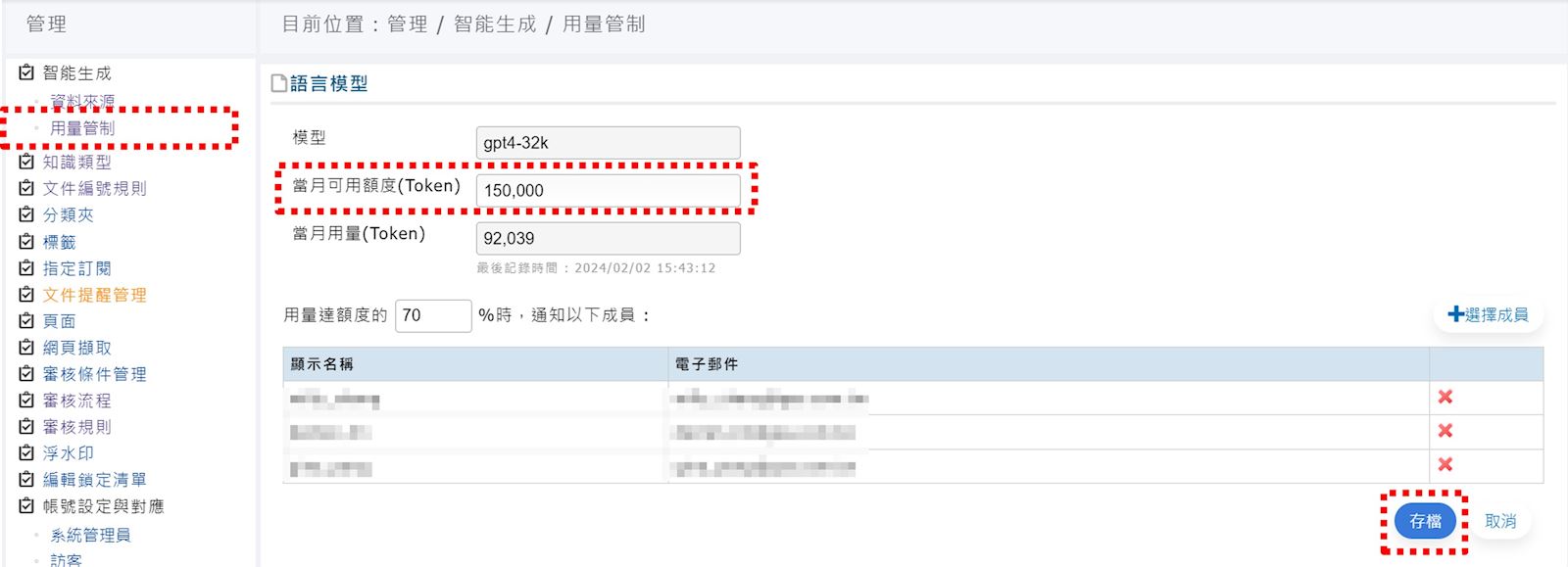 1. 請至【管理】>【智能生成>用量管制】。此處可看到【模型】、【當月用量】,輸入【當月可用額】度來設定上限。請點選【存檔】以套用設定。