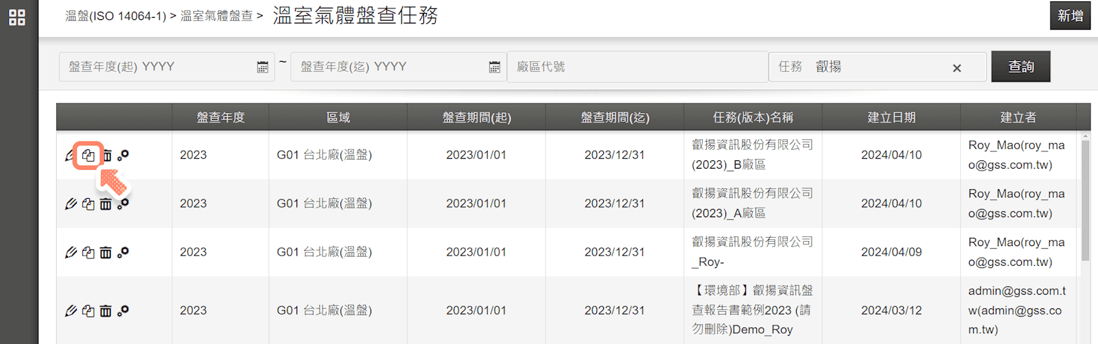如果我們需要將前一個年度的報告任務的活動數據複製到新的年度使用,透過【溫室氣體盤查任務】的搜尋功能,找到要複製的報告任務名稱,點選圖示,如圖 1 所示。