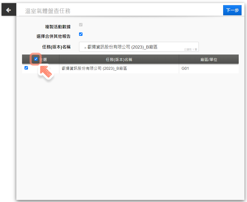 接著報告任務將顯示【複製活動數據】勾選框,將勾選框打勾之後,點選【下一步】,開始填寫報告任務的基本資料,包含盤查年度、廠區等資訊,填寫完之後,選擇新的報告任務要使用的報告範本,即可成功複製一份保有活動數據的報告任務,如圖 2、圖 3 所示。