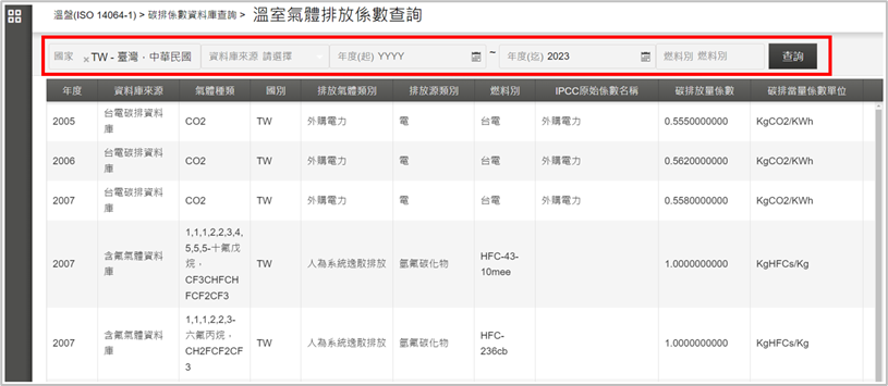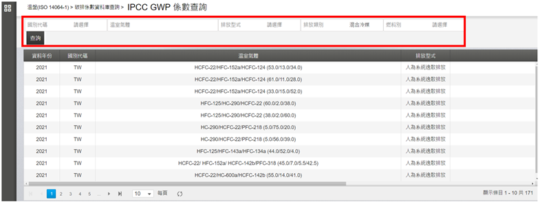 〔IPCC GWP係數查詢〕:可依照國別、排放形式、排放類別、燃料別進行查詢