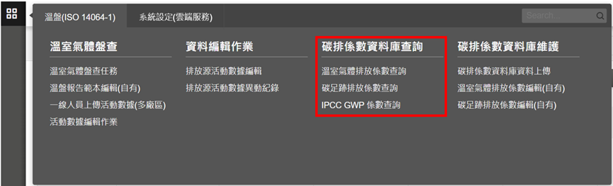 如果需要查看公有的碳排放係數,請點選左上角「全站功能」選單,點選「碳排係數資料庫查詢」底下的〔溫室氣體排放係數查詢〕、〔碳足跡排放係數資料庫查詢〕、〔IPCC GWP係數查詢〕