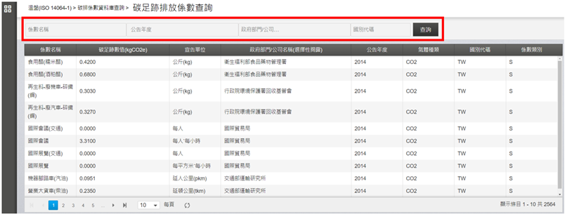 〔碳足跡排放係數查詢〕:可依照係數名稱、公告年度、政府部門/公司、國別代碼進行查詢