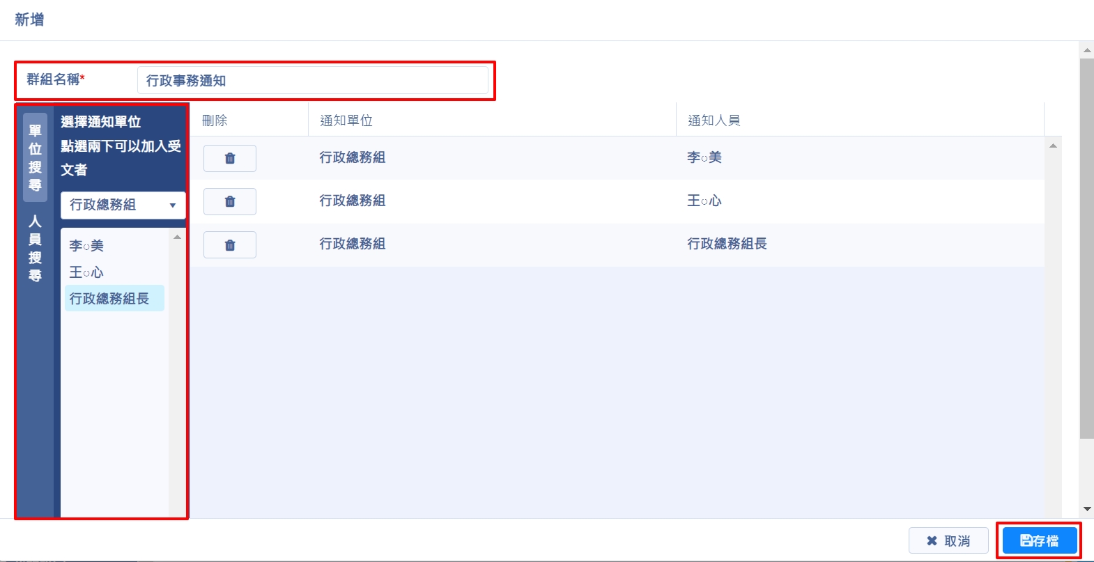 2. 進入通知群組維護畫面後,便可以開始【新增】需要被通知的人員。輸入您的【群組名稱】,左方可以進行【單位搜尋】或【人員搜尋】,新增完該通知群組,記得按下【存檔】即完成通知群組設定。