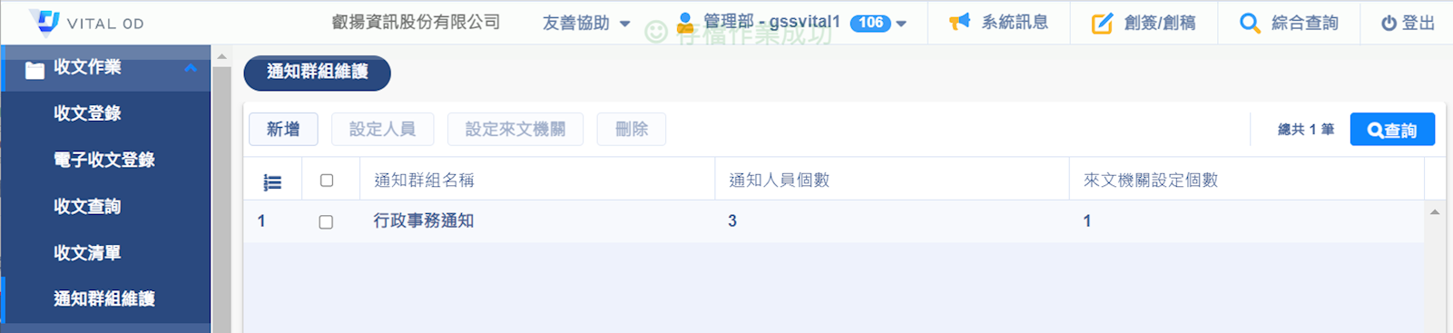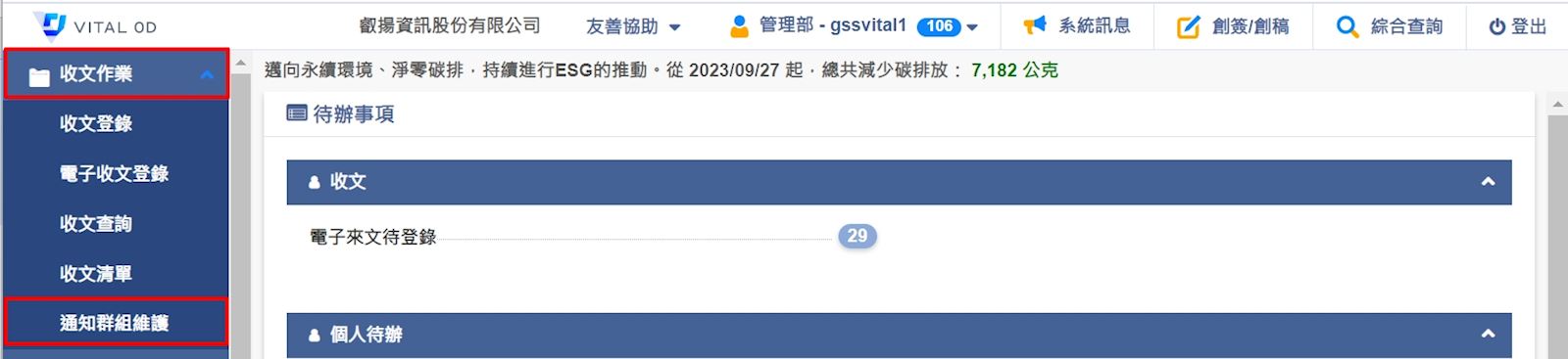 1. 請點擊左方功能列表的【收文作業>通知群組維護】。