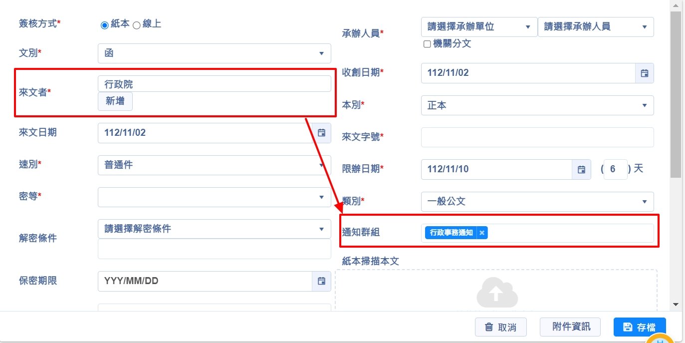 4. 當來文機關為「行政院」時,系統會自動帶入通知群組。