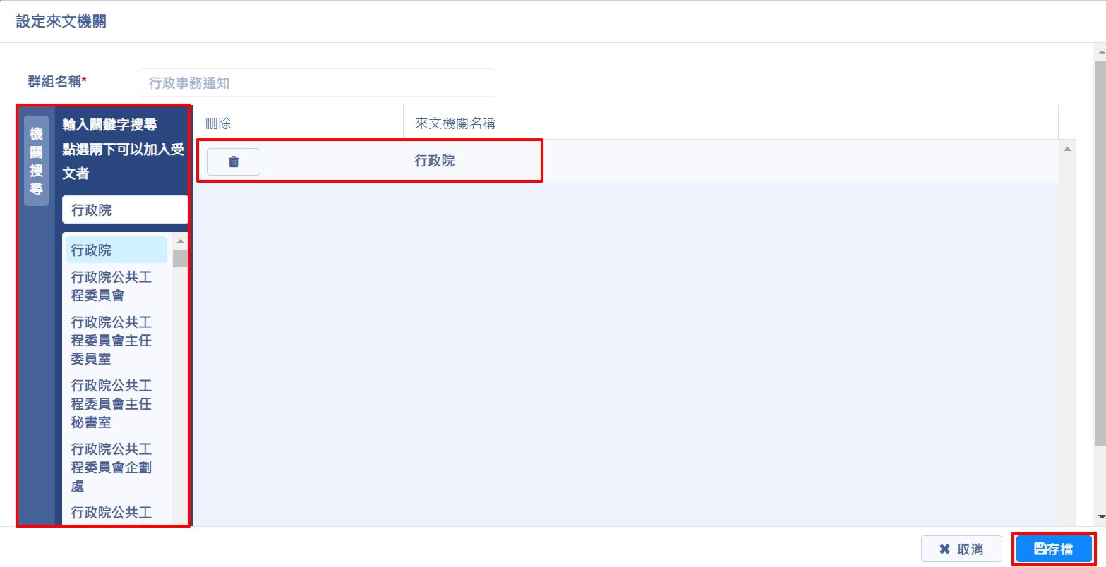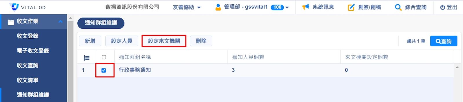 2.查出通知群組後勾選欲設定的群組,點選【設定來文機關】。