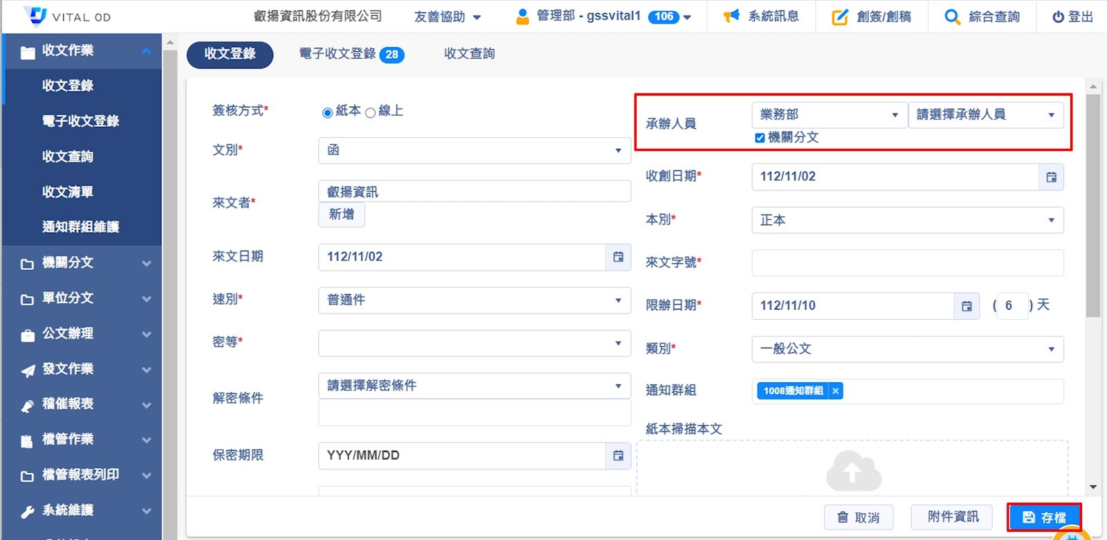 若要進行機關分文,請在公文登錄時,在承辦人員欄位下方勾選【機關分文】,資料確認完成後請點選【存檔】,系統會自動傳送公文流程到長官的機關分文