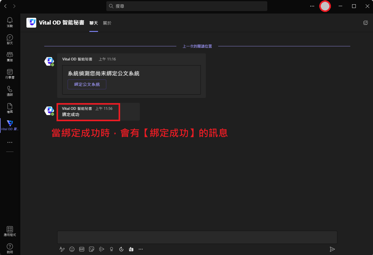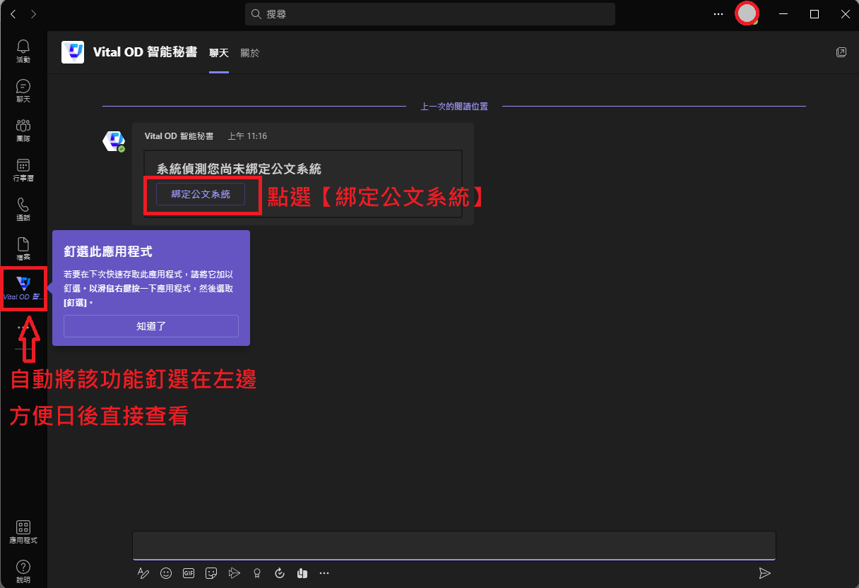 送件通知及決行通知,可透過 Microsoft Teams 接收訊息,操作方式如下: