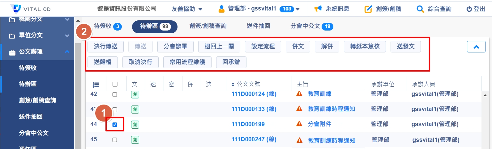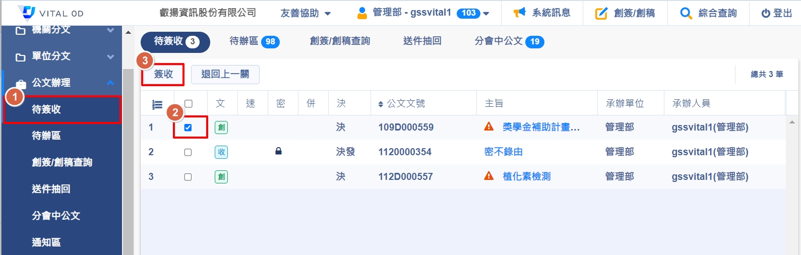 1. 在收到實體的紙本公文後,到系統點擊【公文辦理>待簽收】中勾選公文進行簽收,簽收完後,您才可以到【公文辦理>待辦區】中辦理公文。