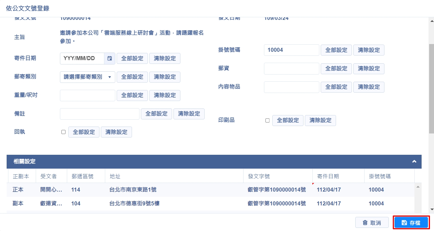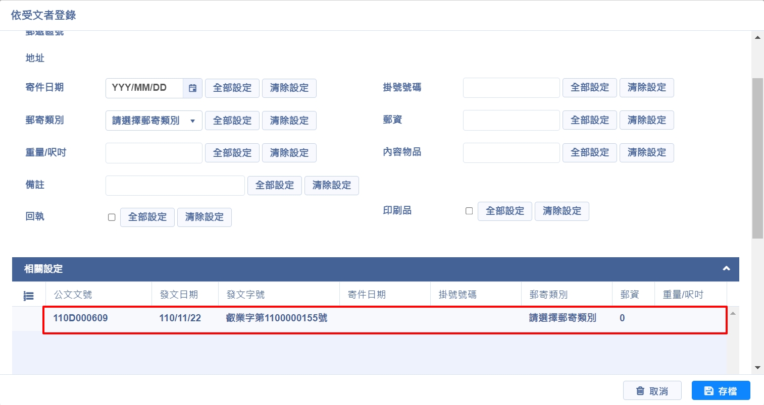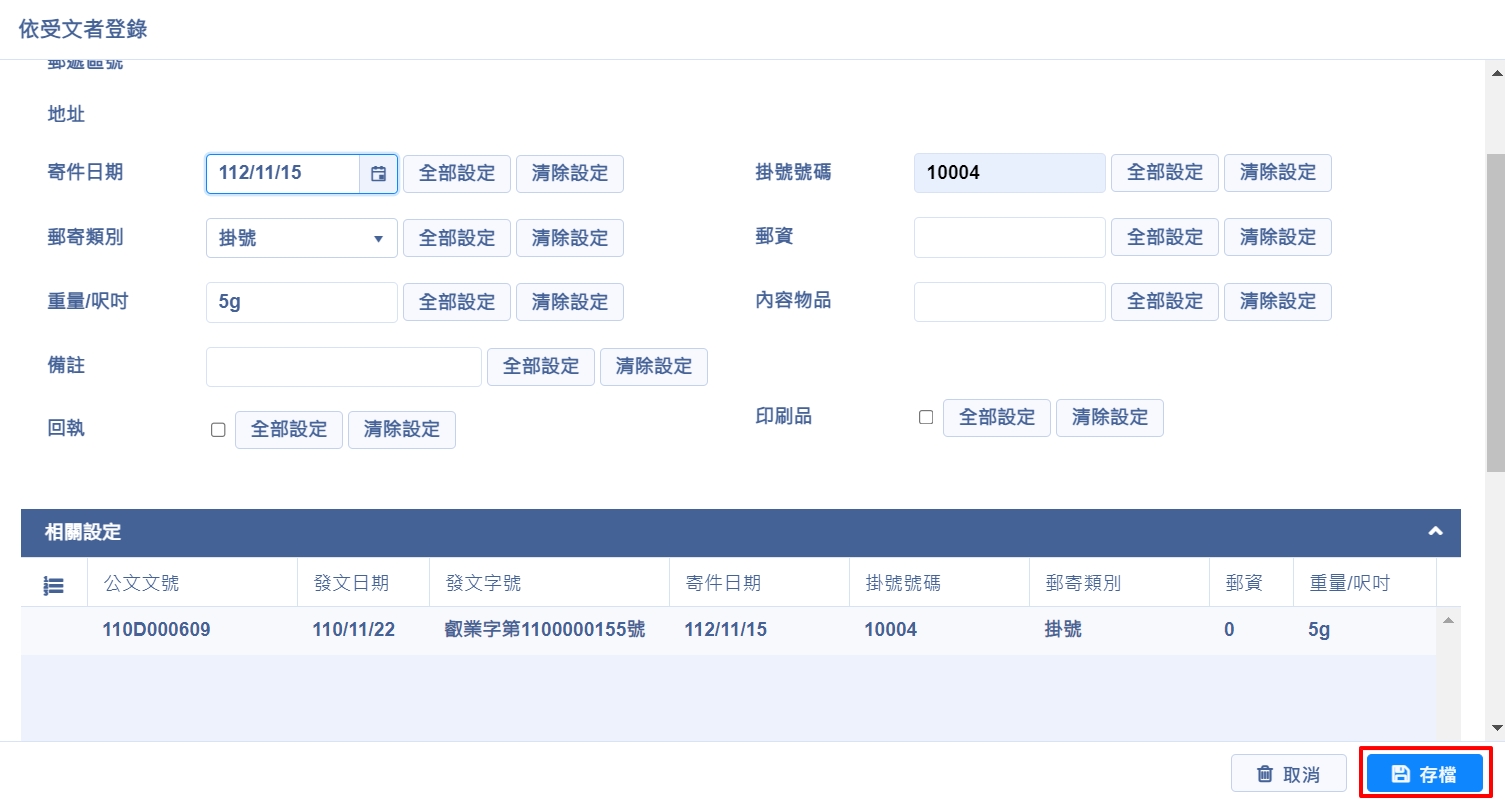 登錄方式與【依公文文號登錄】方式相同,可單筆編輯,也可於上方欄位輸入後點選【全部設定】整批套用,或點選【清除設定】整批刪除欄位資料,完成後點選【存檔】,即完成編輯作業