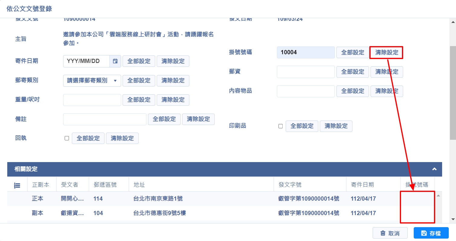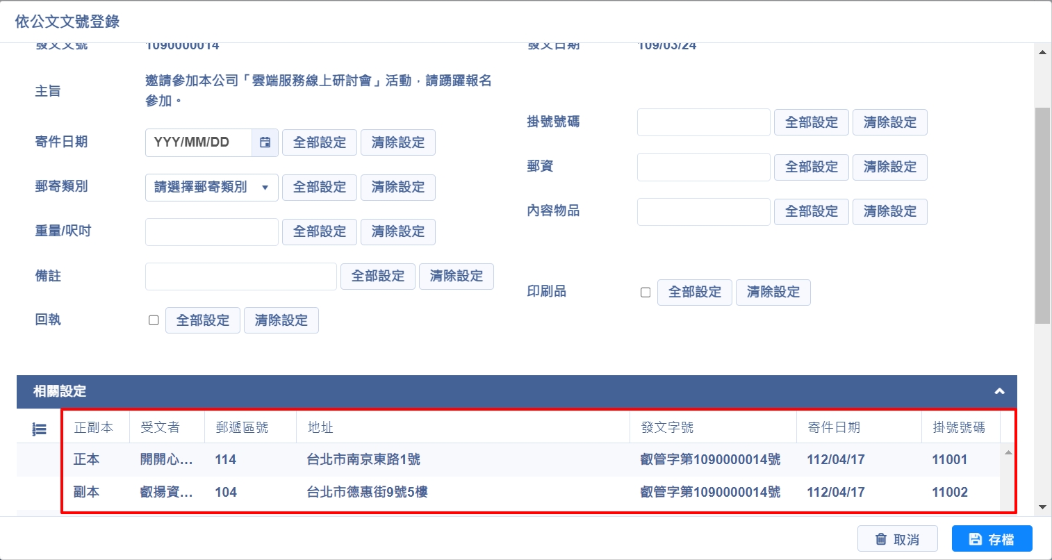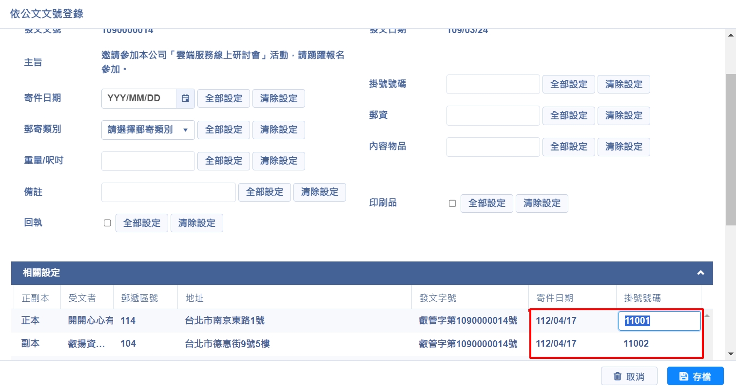 登錄方式與【依公文文號登錄】方式相同,可單筆編輯,也可於上方欄位輸入後點選【全部設定】整批套用,或點選【清除設定】整批刪除欄位資料,完成後點選【存檔】,即完成編輯作業