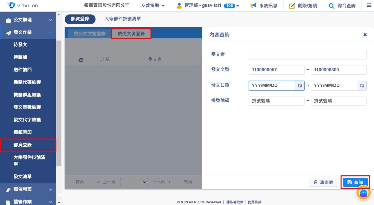 1. 發文人員可於【發文作業>郵資登錄>依受文者登錄】,輸入查詢資料點選「查詢」後,則可查出符合條件及有進行紙本發文的受文者。