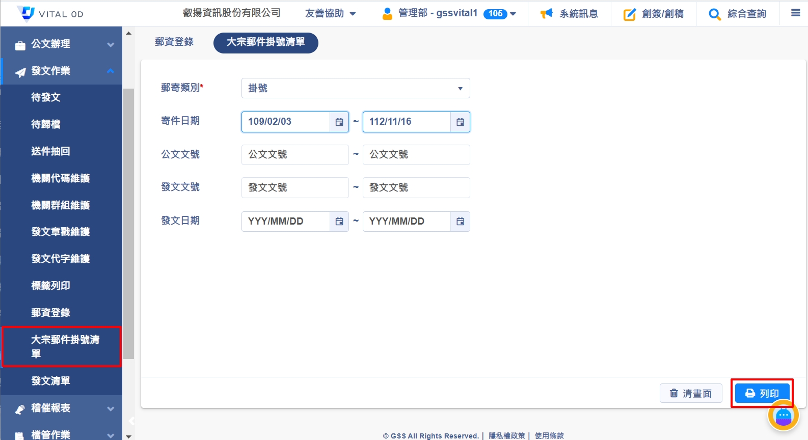 1. 郵資登錄完畢後,可於【發文作業>大宗郵件掛號清單】,列印出大宗郵件清單。